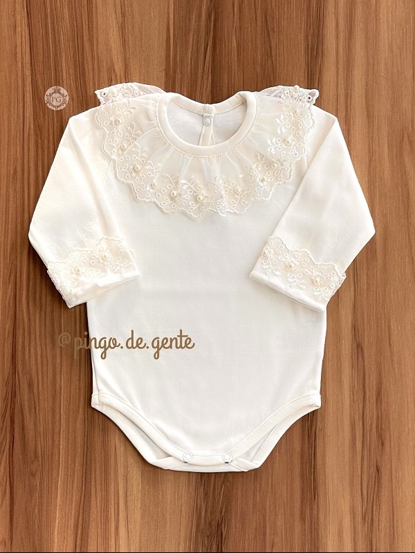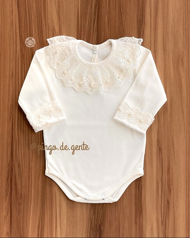 O body de golinha rendada é a peça que faltava para deixar os looks das baby girls mais glamourosos! Todo em algodão egípcio, o body possui fechamento por botão nas costas e no gancho, a golinha em renda com pérolas bordadas, além da aplicação de renda com pérolas também nos punhos. Ele pode ser usado por baixo dos rompers, macaquinhos, jardineiras, banhos de sol, macacões, ou, até mesmo, como a estrela da produção, combinado à calças, shorts, e sainhas.