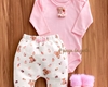 O primeiro conjuntinho tem o body rosinha de mangas bufantes com a Ursinha Cora bordada em relevo fofinho, combinada à calça toda estampada de docinhos!
