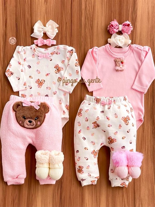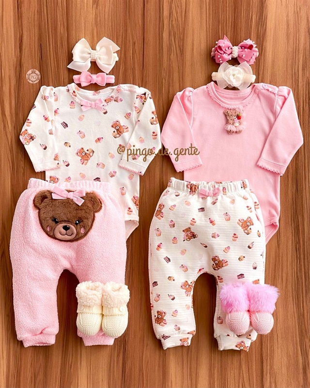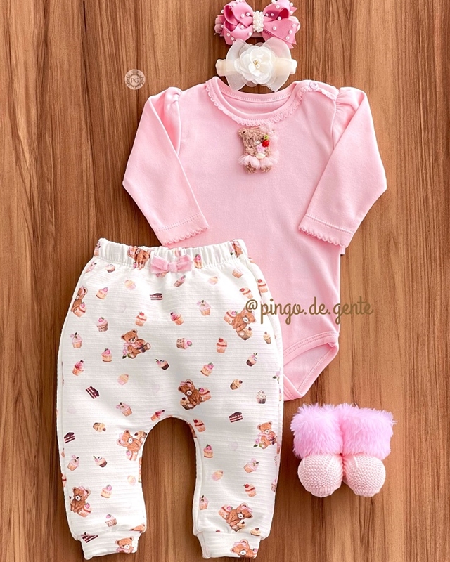 O segundo conjuntinho tem o body estampado de ursinhas e docinhos, combinado à calça em plush bouclé rosa com a Ursinha Cora bordada em relevo fofinho no bumbum!