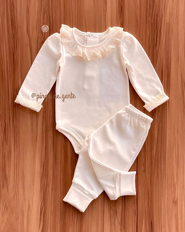 O conjunto Dorothy é todo em algodão egípcio de toque maio e sedoso, composto pelo body de golinha e punhos rendados, combinado à calça de pézinhos reversíveis, nessa cor off white bem delicada e ótima para fazer combinações com muitas cores de acessórios e formar looks infinitos.
