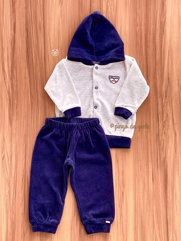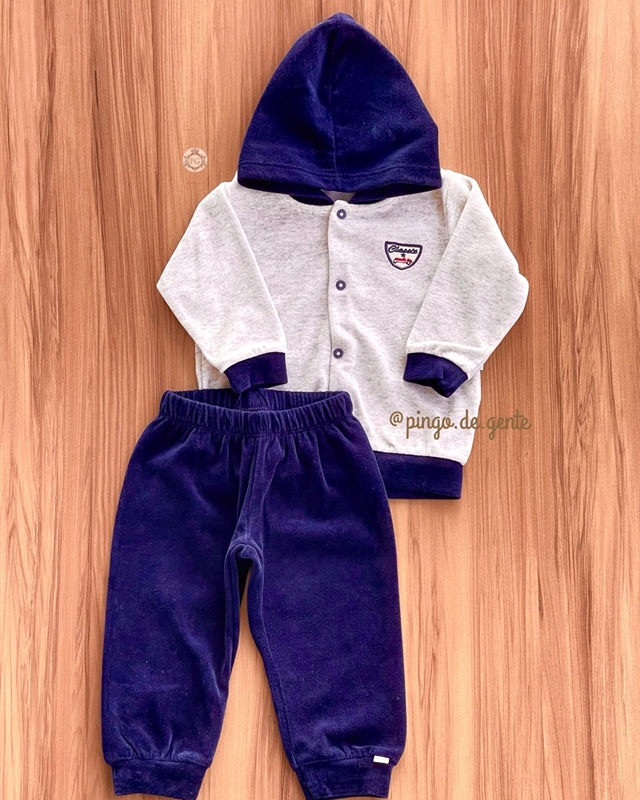 O conjunto Classic é composto pelo casaco, com fechamento frontal por botões, capuz, bordado na lateral do busto, combinado à calça com elástico na cintura e punhos na barra. Tudo em plush bem macio e confortável!
