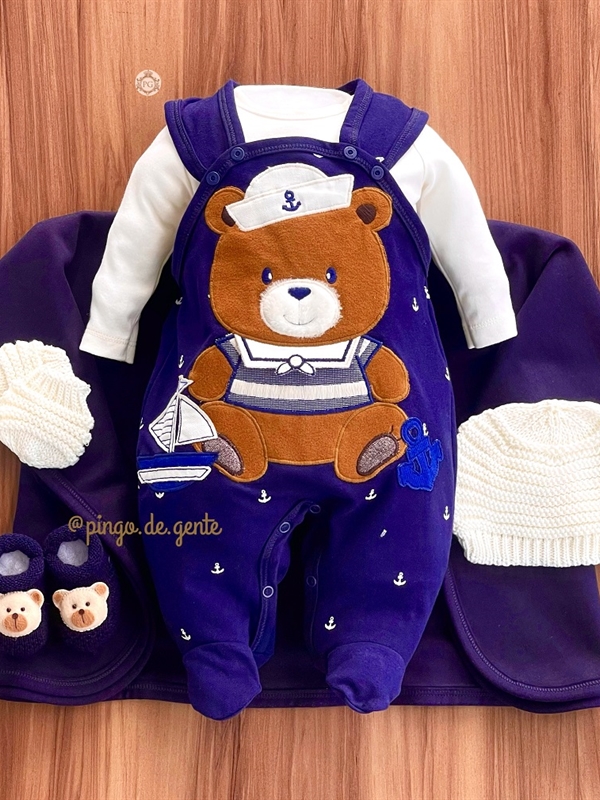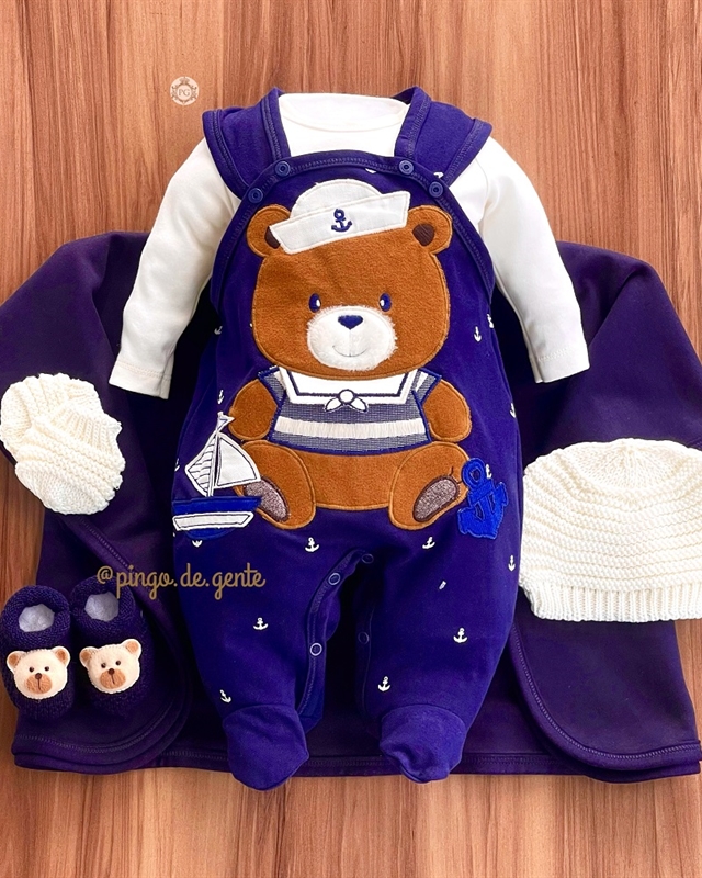 O Macacão é em algodão marinho, de alcinhas, com âncoras estampadas, com o Ursinho Giuseppe bordado em relevo fofinho no tema marinheiro, e já acompanha o body em algodão premium off white.