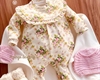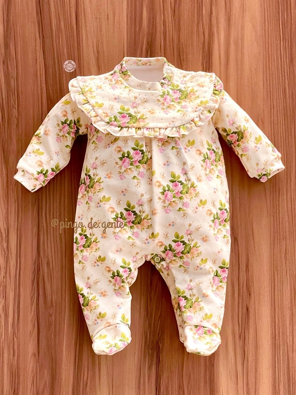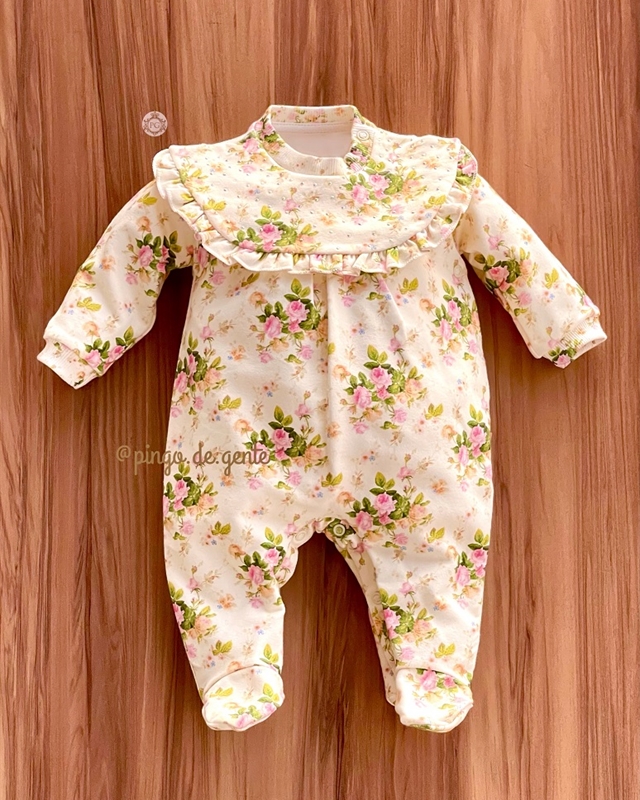 Macacão Siena, uma perfeição, todo em moletinho em uma estampa floral romântica e delicada, com pregas frontais, e o charme da gola babador com mini cristais aplicados e babadinhos! Que luxo!!