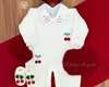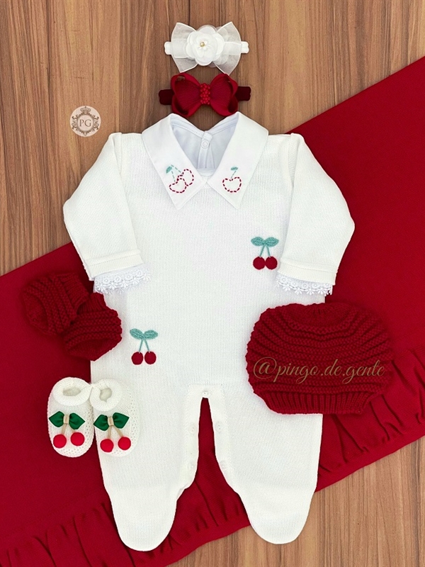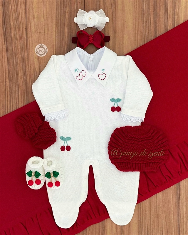 Composta pelo macacão branco, com cerejinhas bordadas manualmente no corpinho, o body de golinha com cerejinhas bordadas e punhos em guipir, e, a manta vermelha de babados por toda a extensão do barrado!