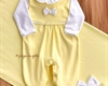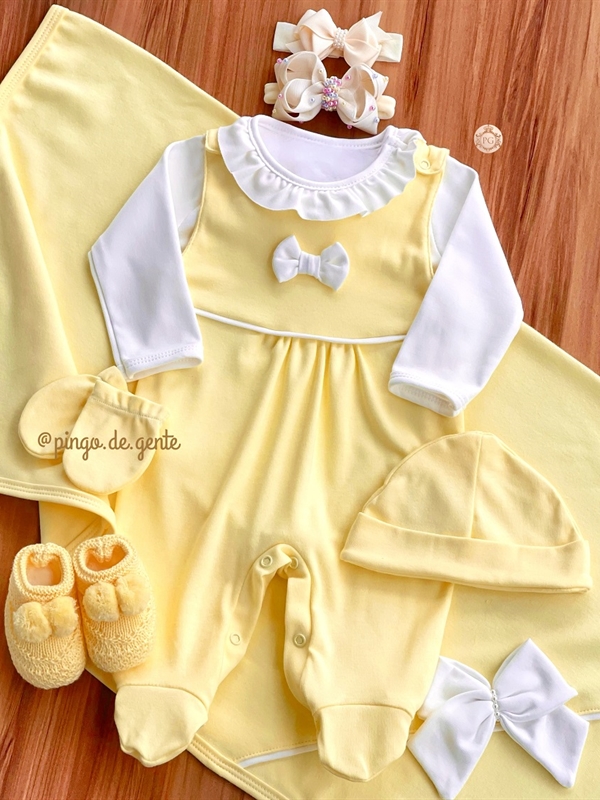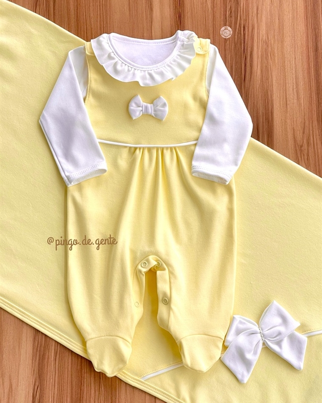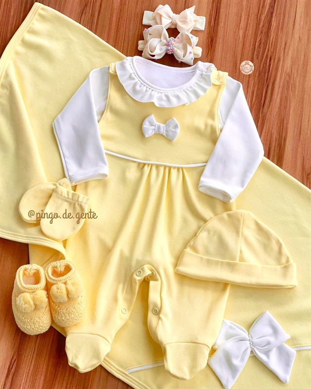 Composta pela jardineira de alcinhas amarela, com pregas frontais, e laço bordado em relevo fofinho, body de golinha de babados off white, e a mantinha amarela com um lindo laço bordado em relevo fofinho na lateral do barrado. As três peças em um algodão egípcio muito confortável, macio e sedoso!