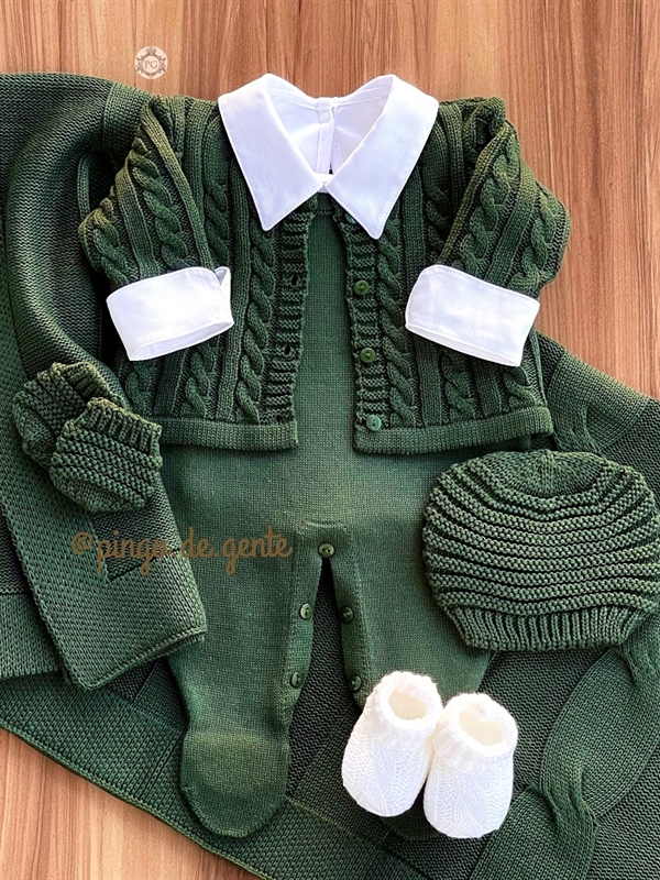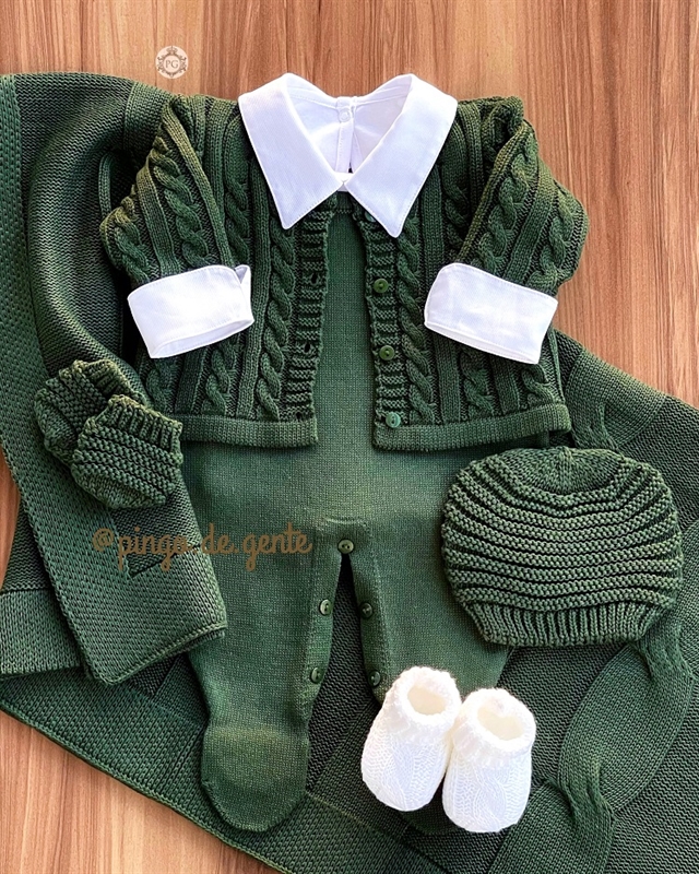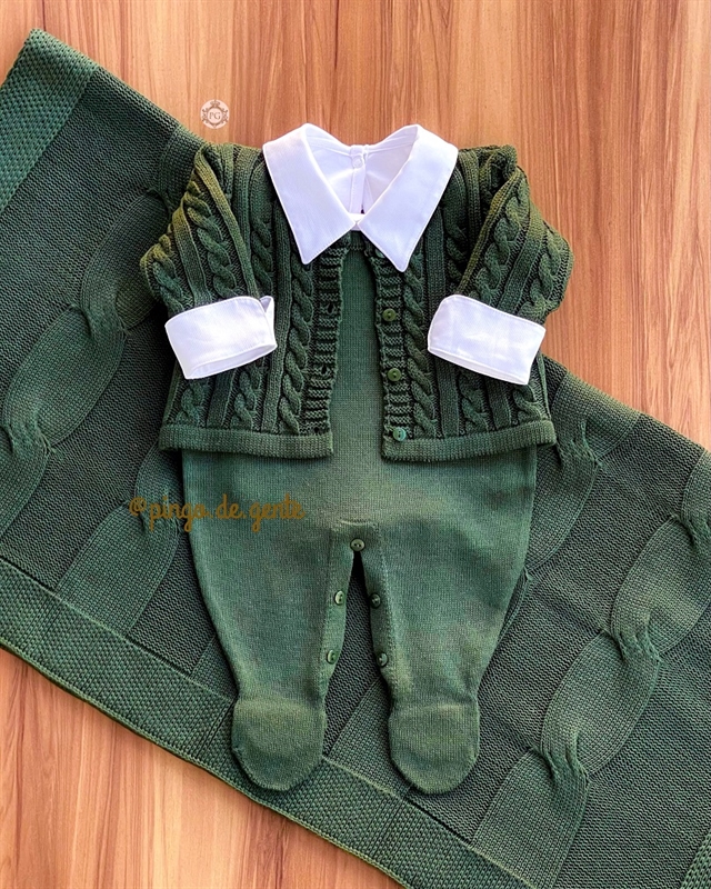 Uma perfeição de saída para os nossos baby boys! A Saída Tranças é um modelo clássico e super chique! Composta pelo macacão cavadinho, body de golinha de camisa com ursinhos bordados, casaquinho, e manta, sempre coordenando no trabalho da trama, que é um luxo!